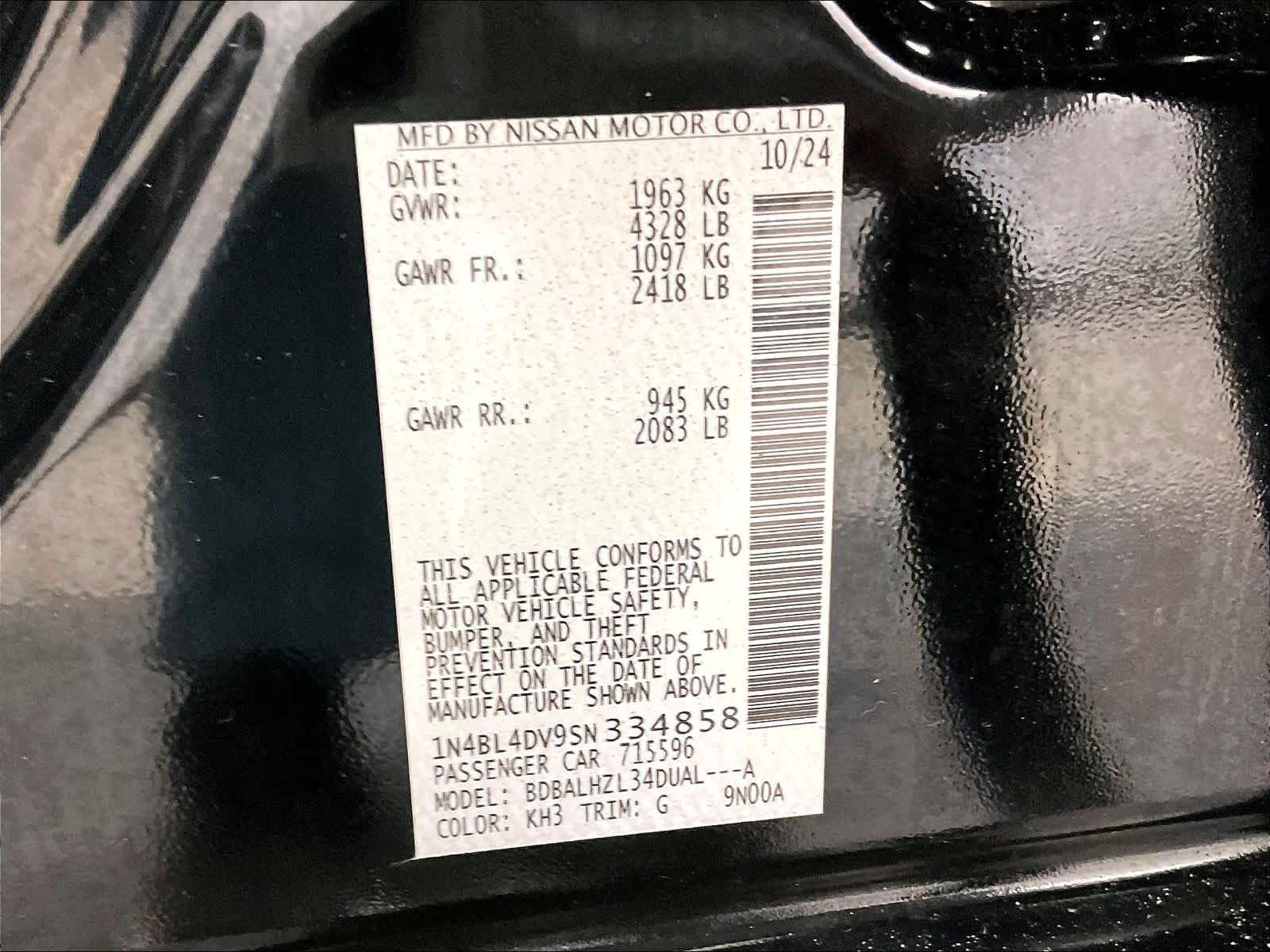 SV | 12,103 milesStock # U1300283 | VIN # 1N4BL4DV9SN334858