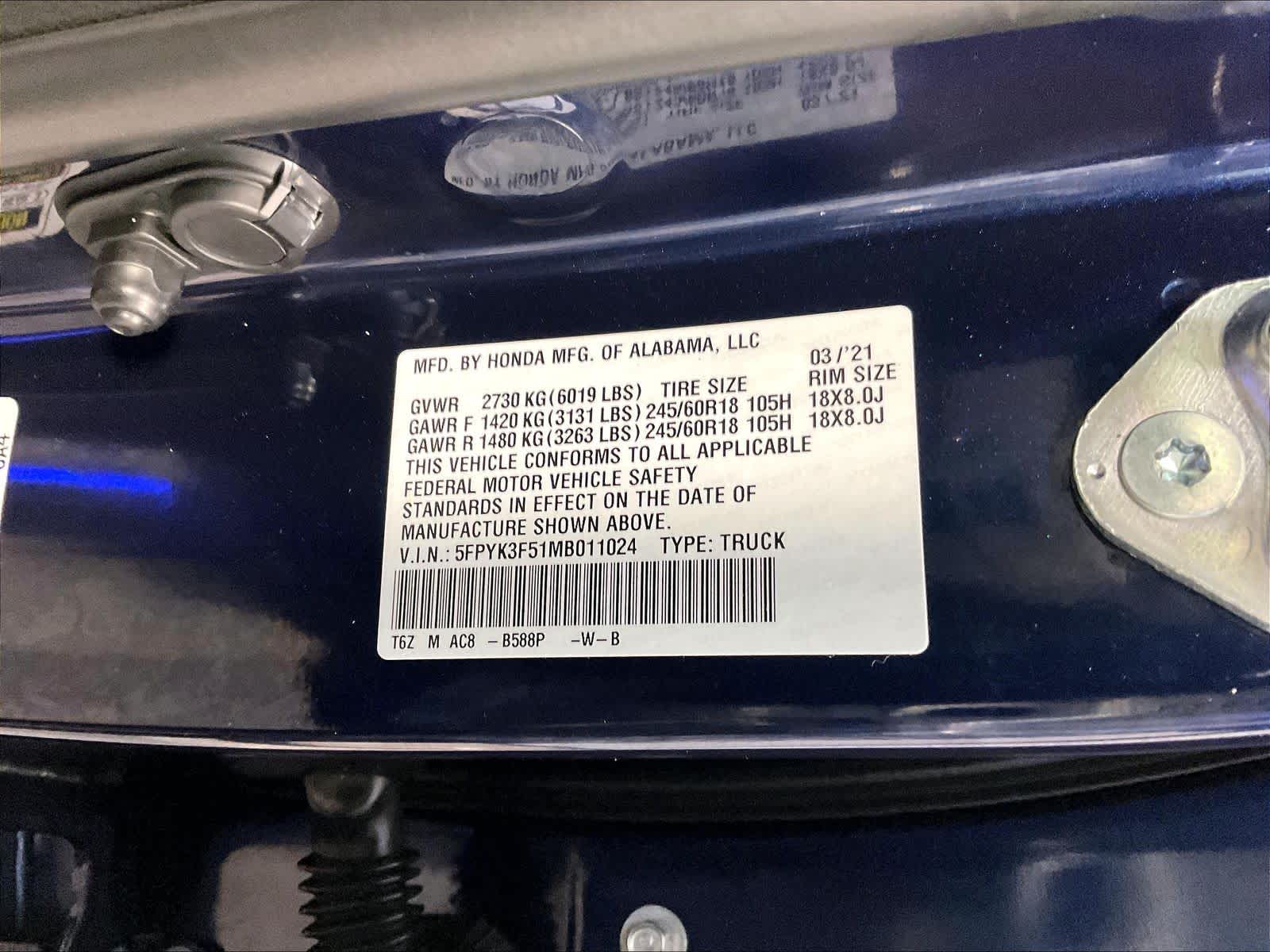 RTL | 60,378 milesStock # U0500186 | VIN # 5FPYK3F51MB011024