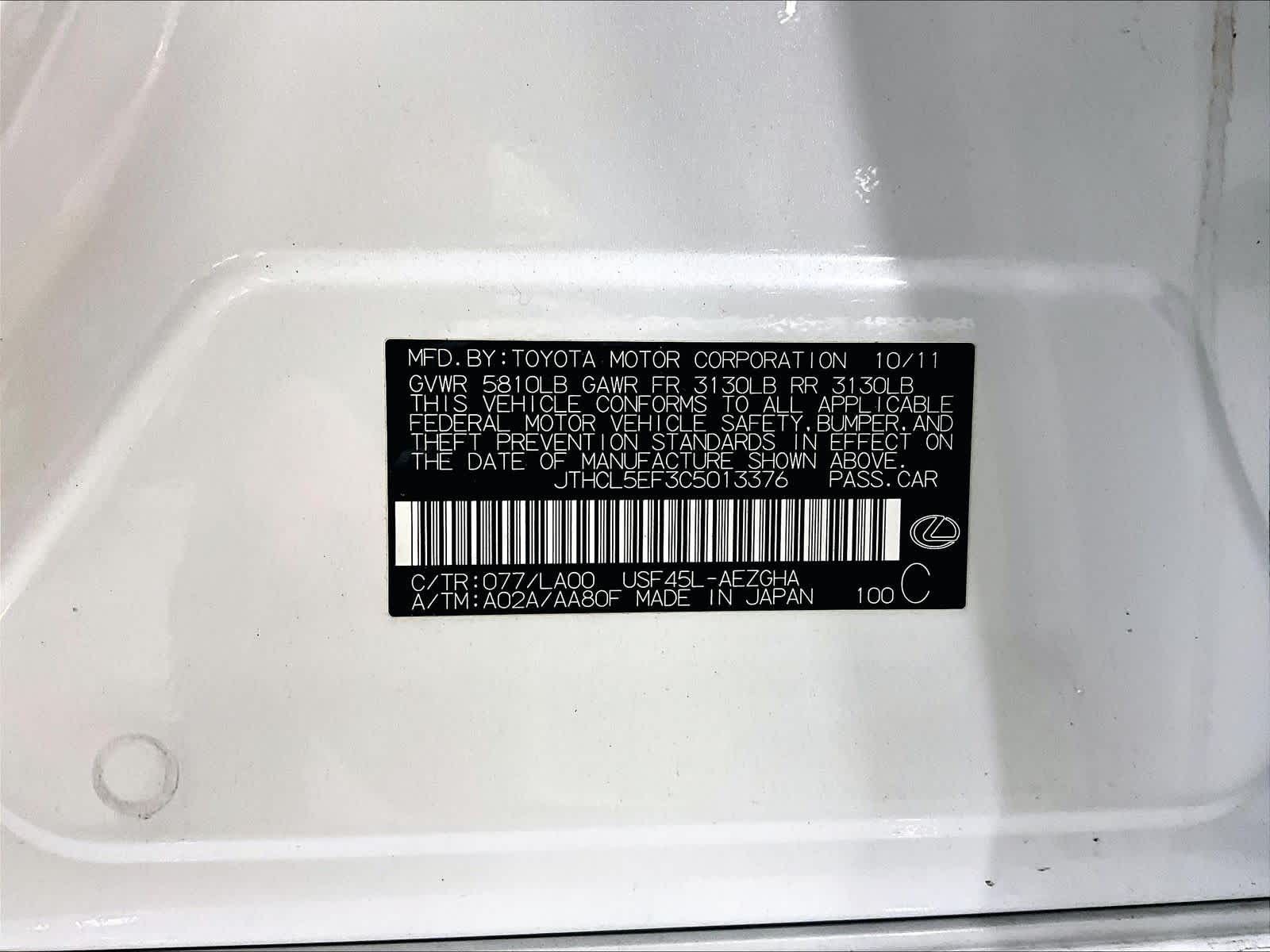 | 97,703 milesStock # N0300946A | VIN # JTHCL5EF3C5013376